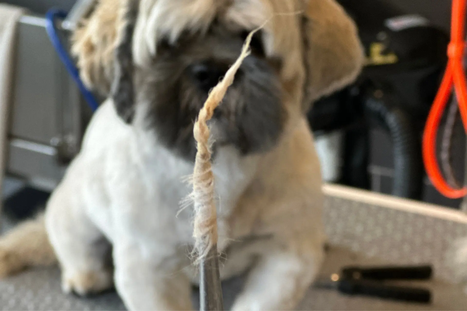 Uitborstelen en ontklitten gebeurt altijd bewust en met respect voor je hond. Kleine klitten of beginnende knopen kan ik voorzichtig uitborstelen, zolang dit comfortabel blijft en je hond hier geen pijn van ondervindt. Wanneer er sprake is van overmatige klitten of vilt, kies ik ervoor om onder de knopen kort te scheren. Ontklitten kan erg pijnlijk zijn en veroorzaakt vaak stress, iets wat ik bewust vermijd.